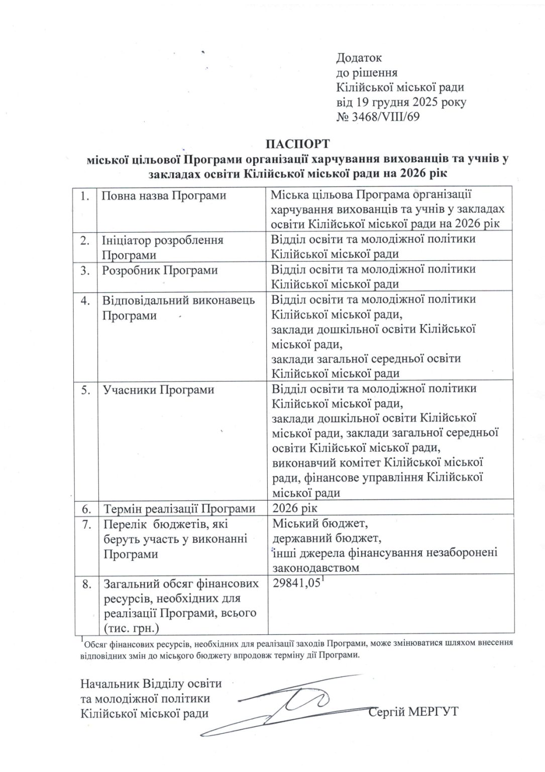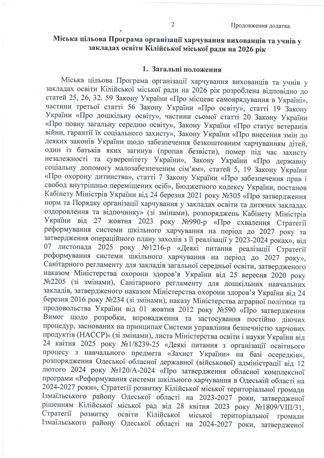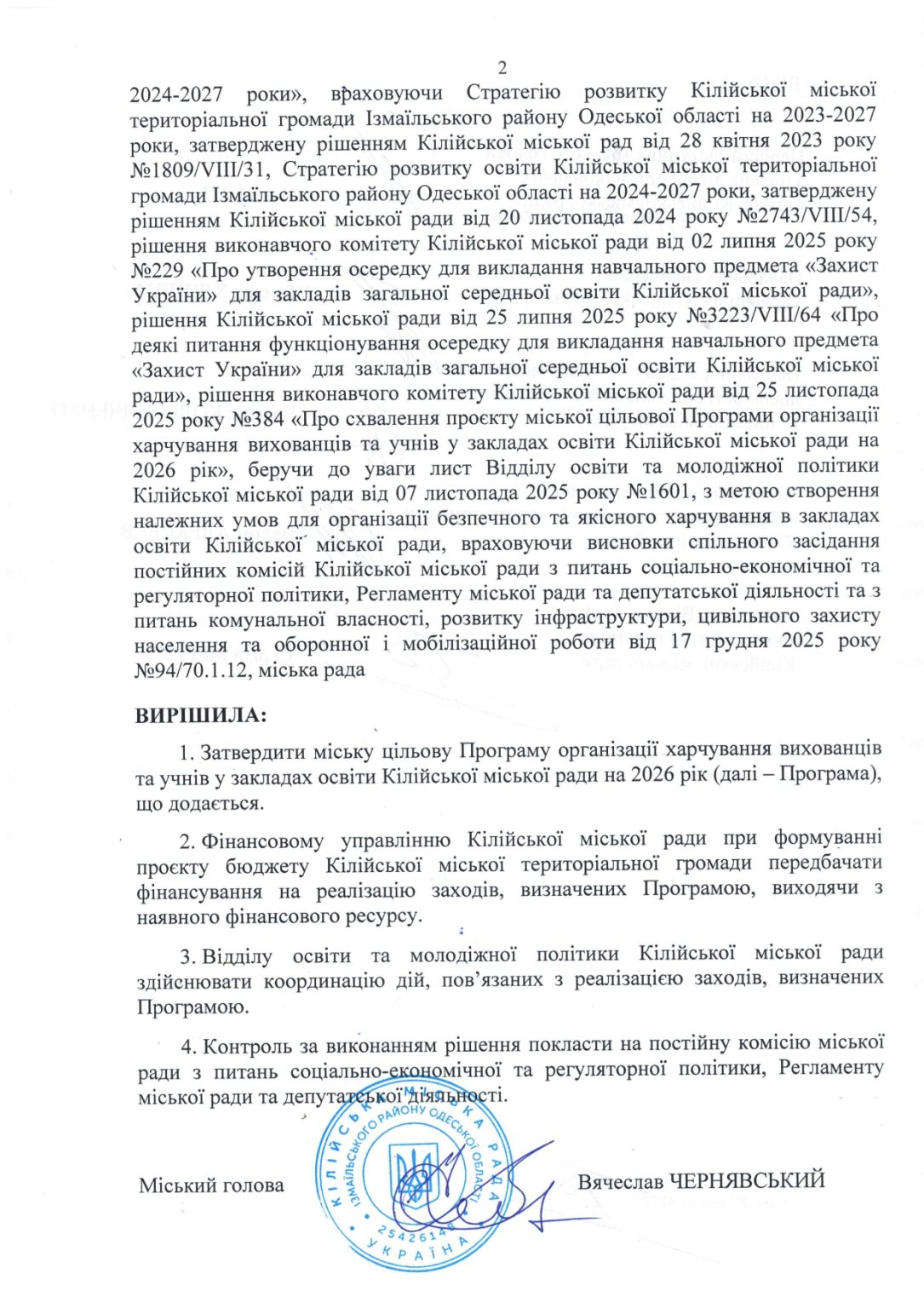 Про затвердження мicькoi цiльової Програми органiзацii харчування вихованцiв та учнiв у закладах освiти Кiлiйськоi міської ради на 2026 рік