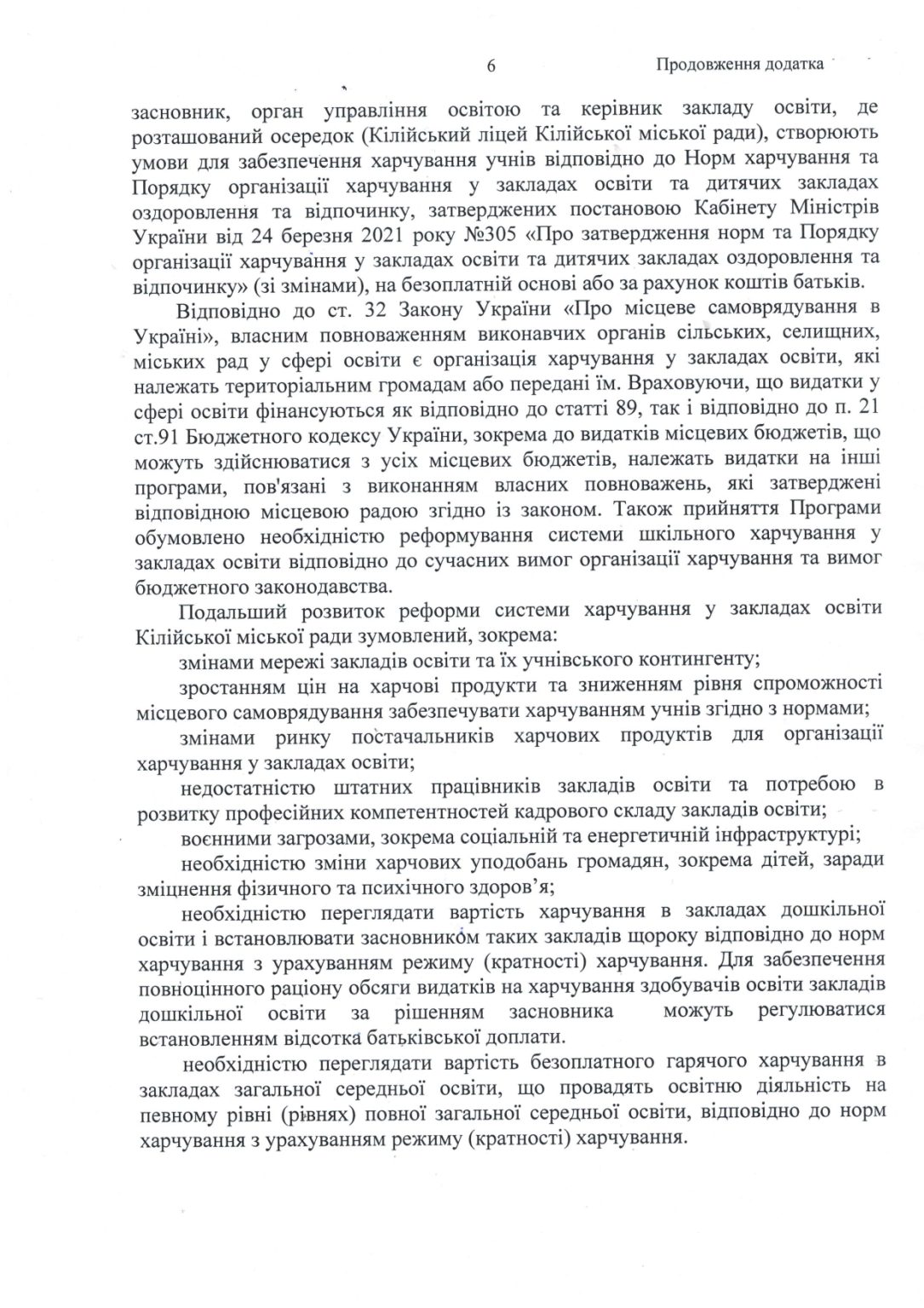 6. Керівникам закладів дошкільної освіти Кілійської міської ради забезпечити організацію харчування дітей у закладах дошкільної освіти Кілійської міської ради відповідно до загальних вікових потреб здобувачів освіти згідно з нормами фізіологічних потреб в основних харчових речовинах