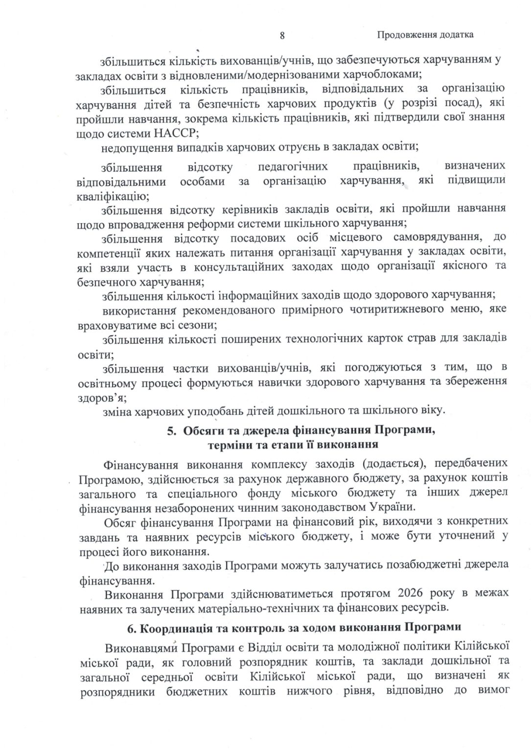 8. Відділу освіти та молодіжної політики Кілійської міської ради здійснювати координацію діяльності з питань організації харчування здобувачів освіти у закладах загальної середньої освіти Кілійської міської ради в межах повноважень відповідно до вимог чинного законодавства України.