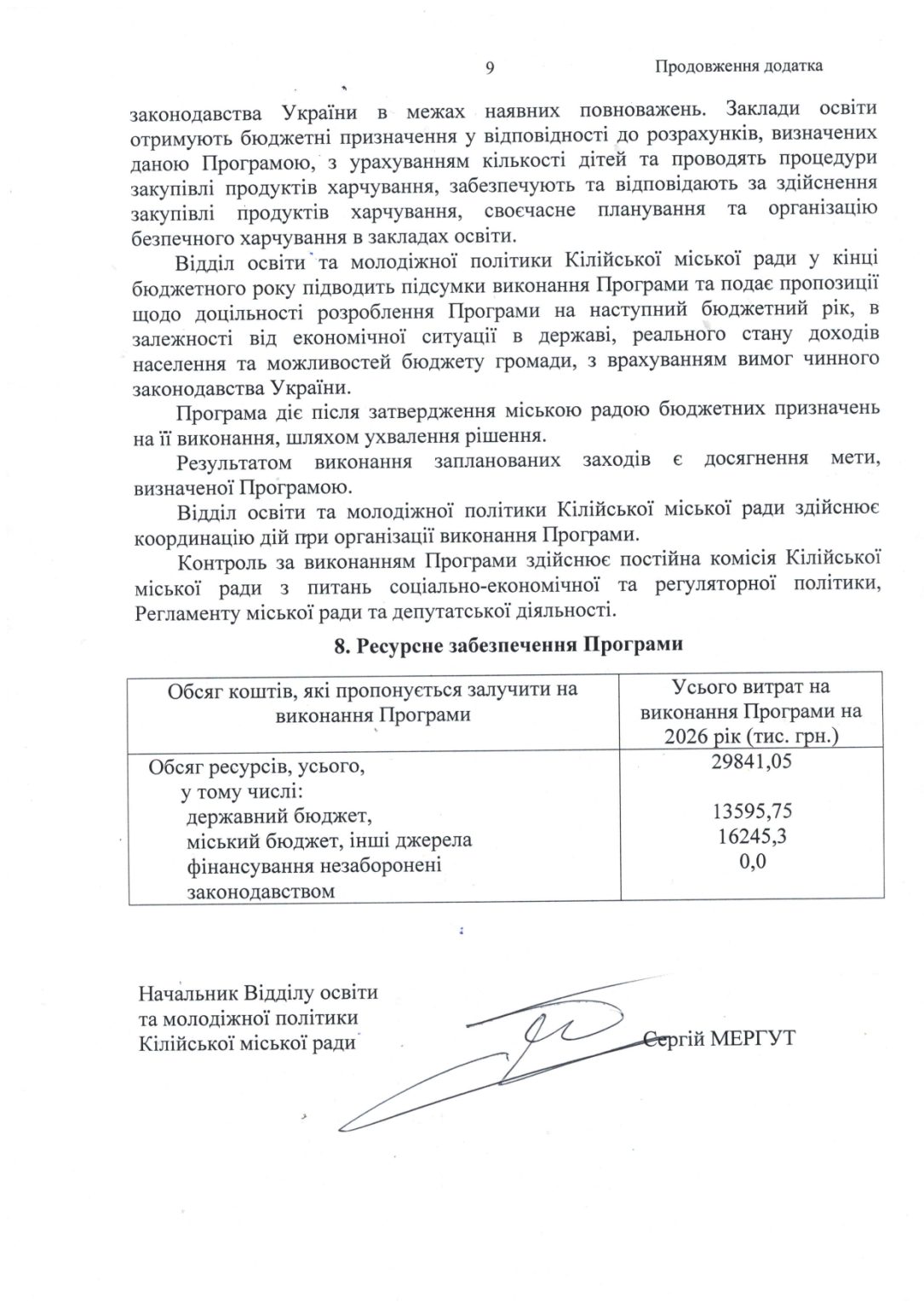 9. Фінансовому управлінню Кілійської міської ради забезпечити фінансування видатків на організацію харчування пільгових категорій дітей у закладах загальної середньої освіти Кілійської міської ради у межах бюджетних призначень.