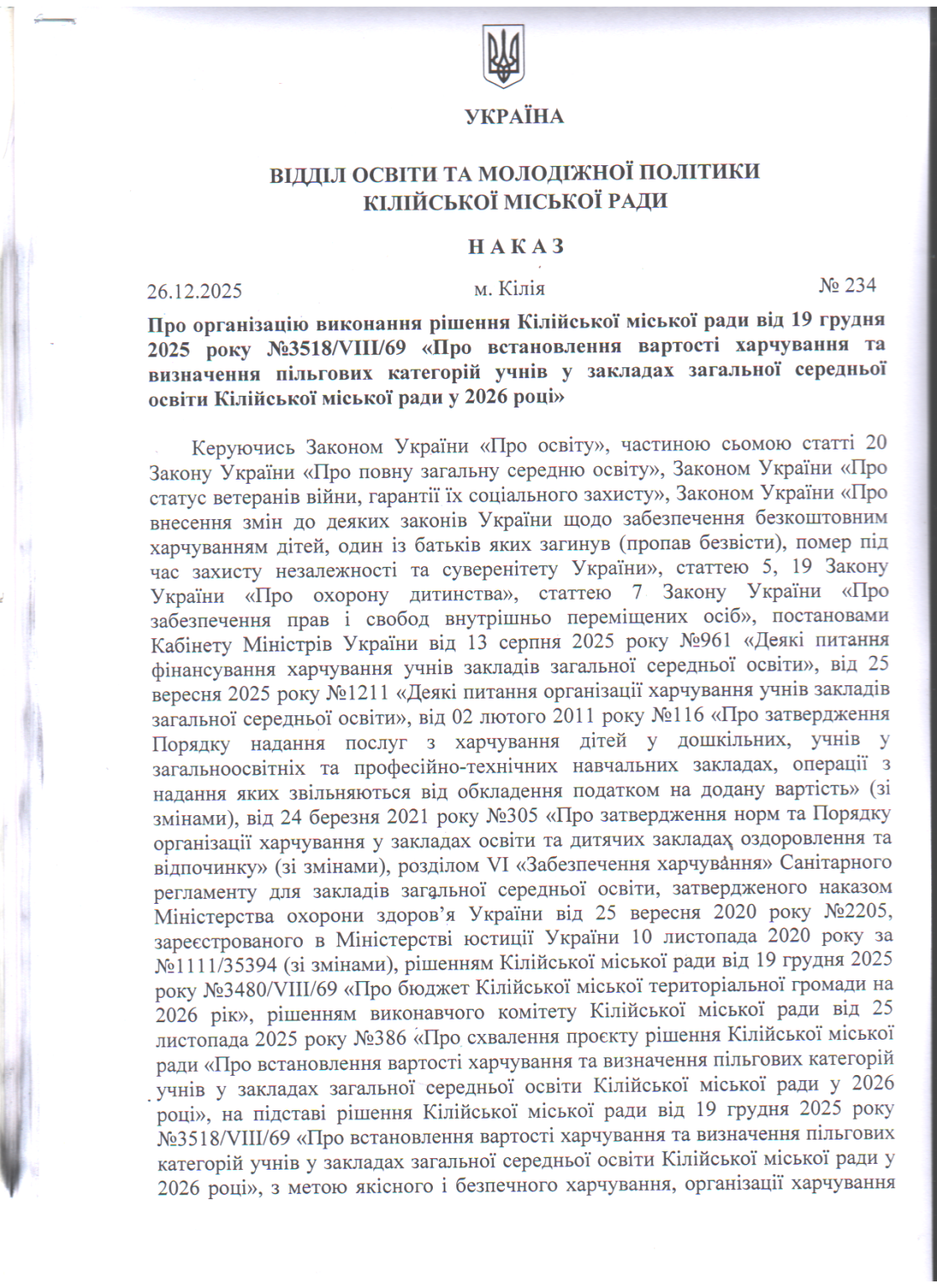 Про організацію виконання рішення Кілійської міської ради від 19 грудня 2025 року №3518/VIII/69 «Про встановлення вартості харчування та визначення пільгових категорій учнів у закладах загальної середньої освіти Кілійської міської ради у 2026 році»