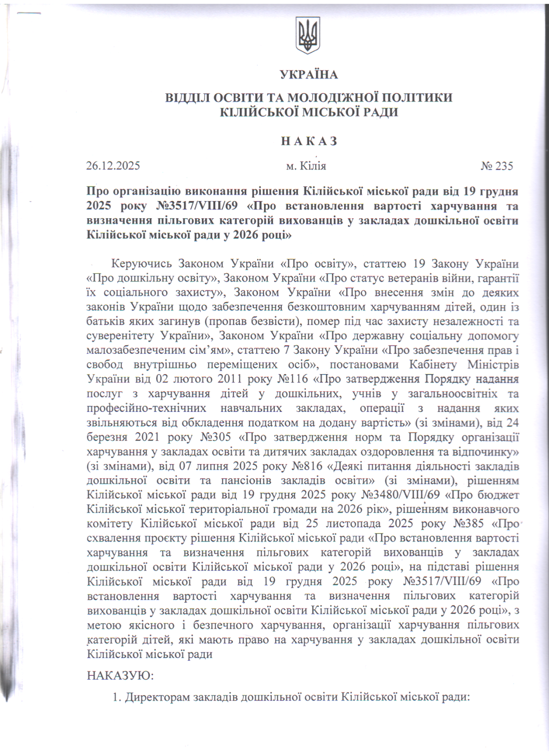 Про організацію виконання рішення Кілійської міської ради від 19 грудня 2025 року №3517/VIII/69 «Про встановлення вартості харчування та визначення пільгових категорій вихованців у закладах дошкільної освіти Кілійської міської ради у 2026 році»