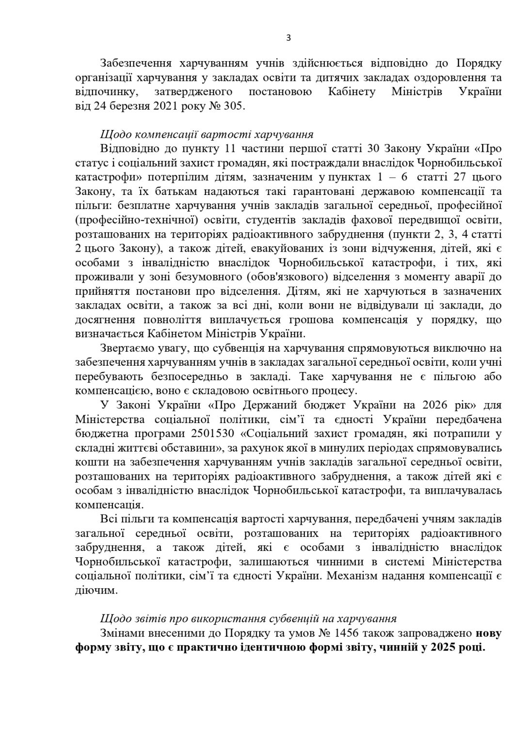 - дітям грудного віку та дітям другого року життя, які входять до складу малозабезпечених сімей, дітям грудного віку та дітям раннього віку, які постраждали внаслідок Чорнобильської катастрофи, мають статус дитини, яка постраждала внаслідок воєнних дій і збройних конфліктів, або з числа внутрішньо переміщених осіб, дітей з числа осіб, визначених у статті 10 та 101 Закону України «Про статус ветеранів війни, гарантії їх соціального захисту» до визначення Кабінетом Міністрів України порядку забезпечення безкоштовним харчуванням зазначених категорій дітей.