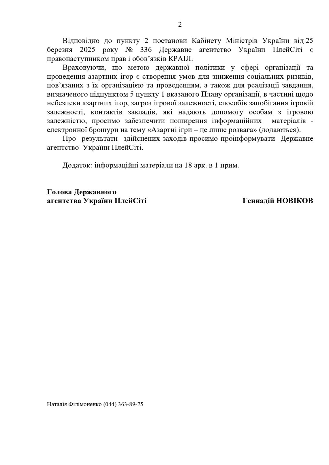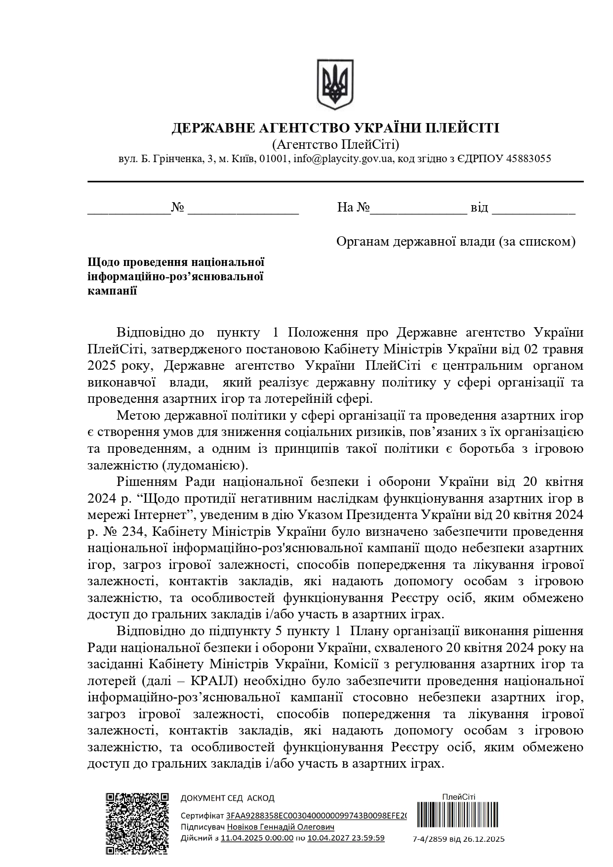 Щодо проведення національної інформаційно-роз’яснювальної кампанії з питань протидії негативним наслідкам функціонування азартних ігор в мережі Інтернет